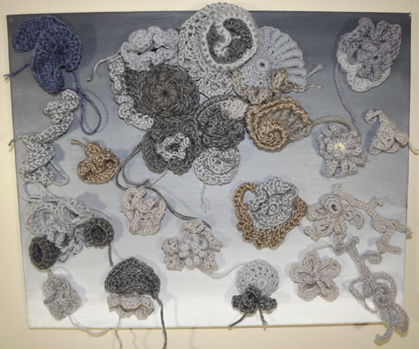 This three dimensional soft sculpture wall art was created as a fantasy piece depicting a view of the Ocean's depth. Steel grey was chosen as the main color to reinforce the relationship of architecture and freeform crochet.